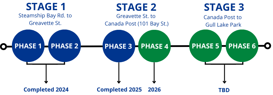 What’s next? The timelines for the project have been adjusted. Construction on Bay St. between Sarah St. and Canada Post (101 Bay St.) is now scheduled for the 2026 construction season. This decision has been made following a thorough review of the current progress and site conditions. While steady advancement has been achieved on the project, unforeseen challenges, combined with seasonal constraints, have impacted the overall pace of the project.