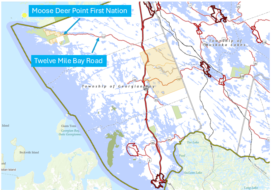 Twelve Mile Bay Road connects Moose Deer Point First Nation on the coast of Georgian Bay, to Hwy 400.