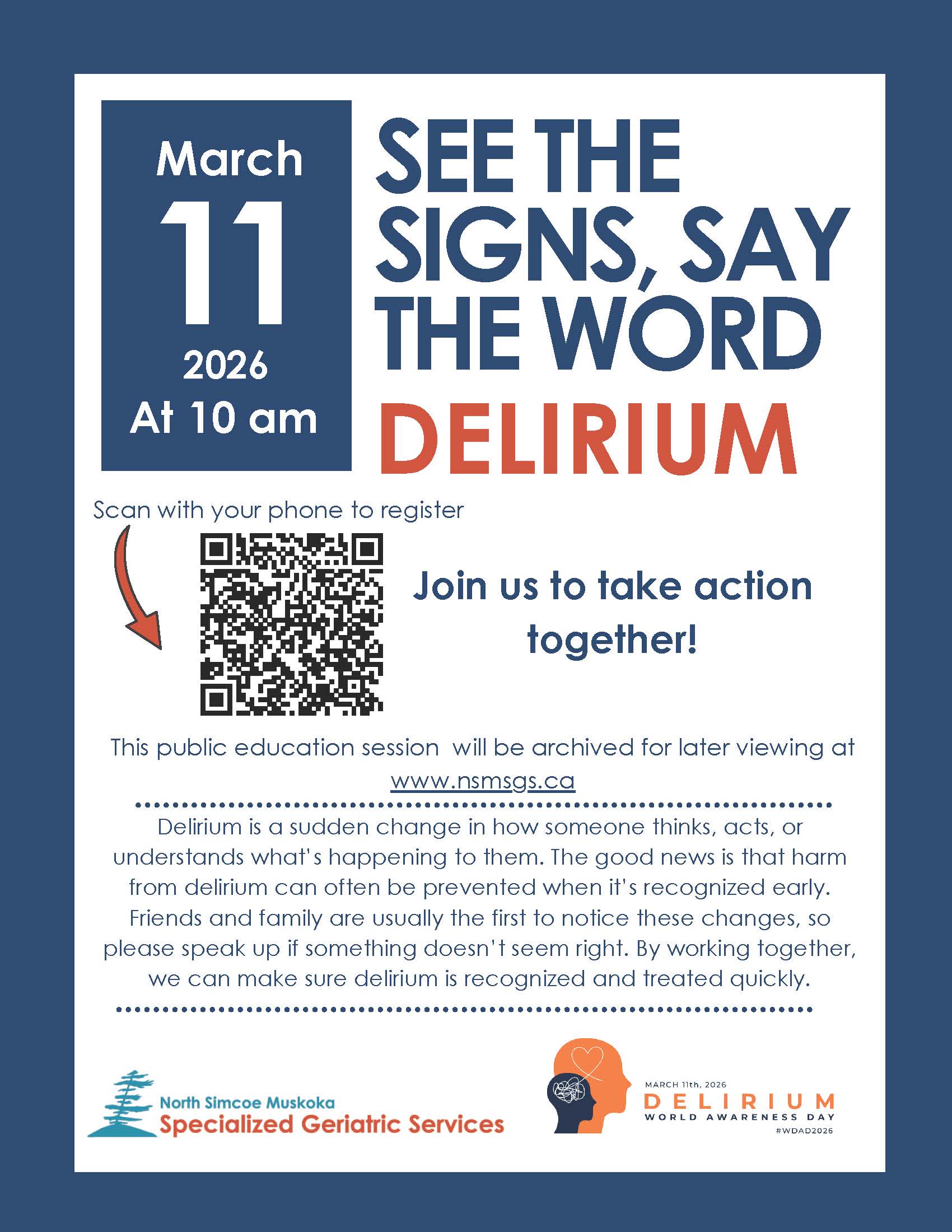 Join North Simcoe Muskoka Specialized Geriatric Services as we take action together for World Delirium Awareness Day for a public education session, intended for older adults, care partners, and the public. Wednesday March 11, 2026 at 10 am. The webinar will be archived for later viewing.
